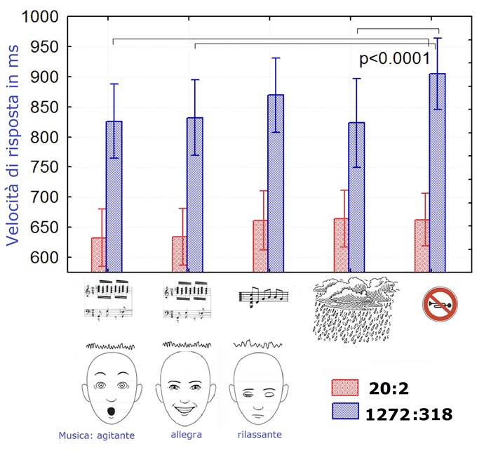L’immagine mostra velocità di risposta registrate a secondo del sottofondo sonoro e del tipo di musica ascoltato. In rosso: dati relativi a calcoli aritmetici di facile risoluzione; in blu dati relativi a calcoli di difficile risoluzione